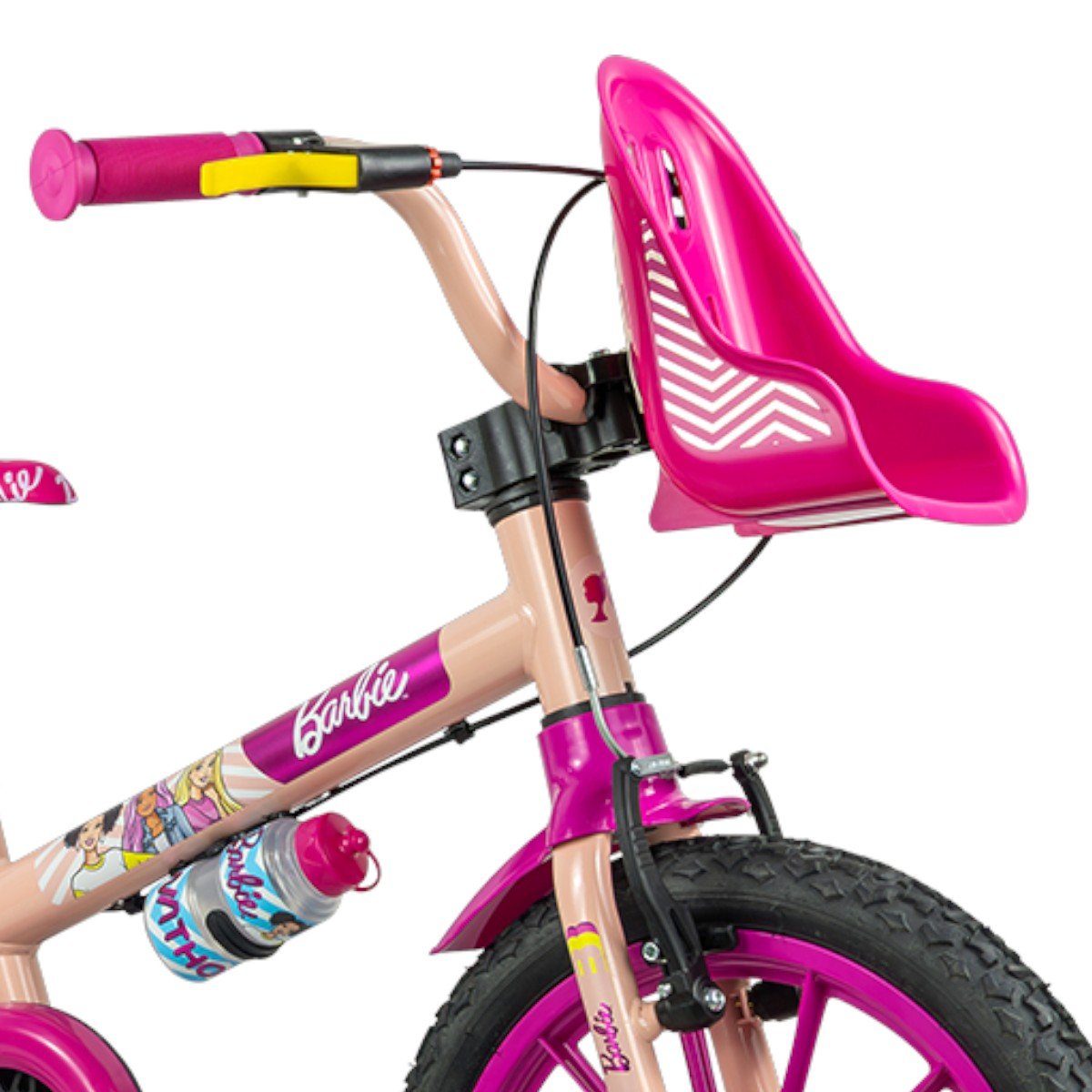 A aro 16” tem pneus com câmara, quadro em aço carbono e garrafinha.
