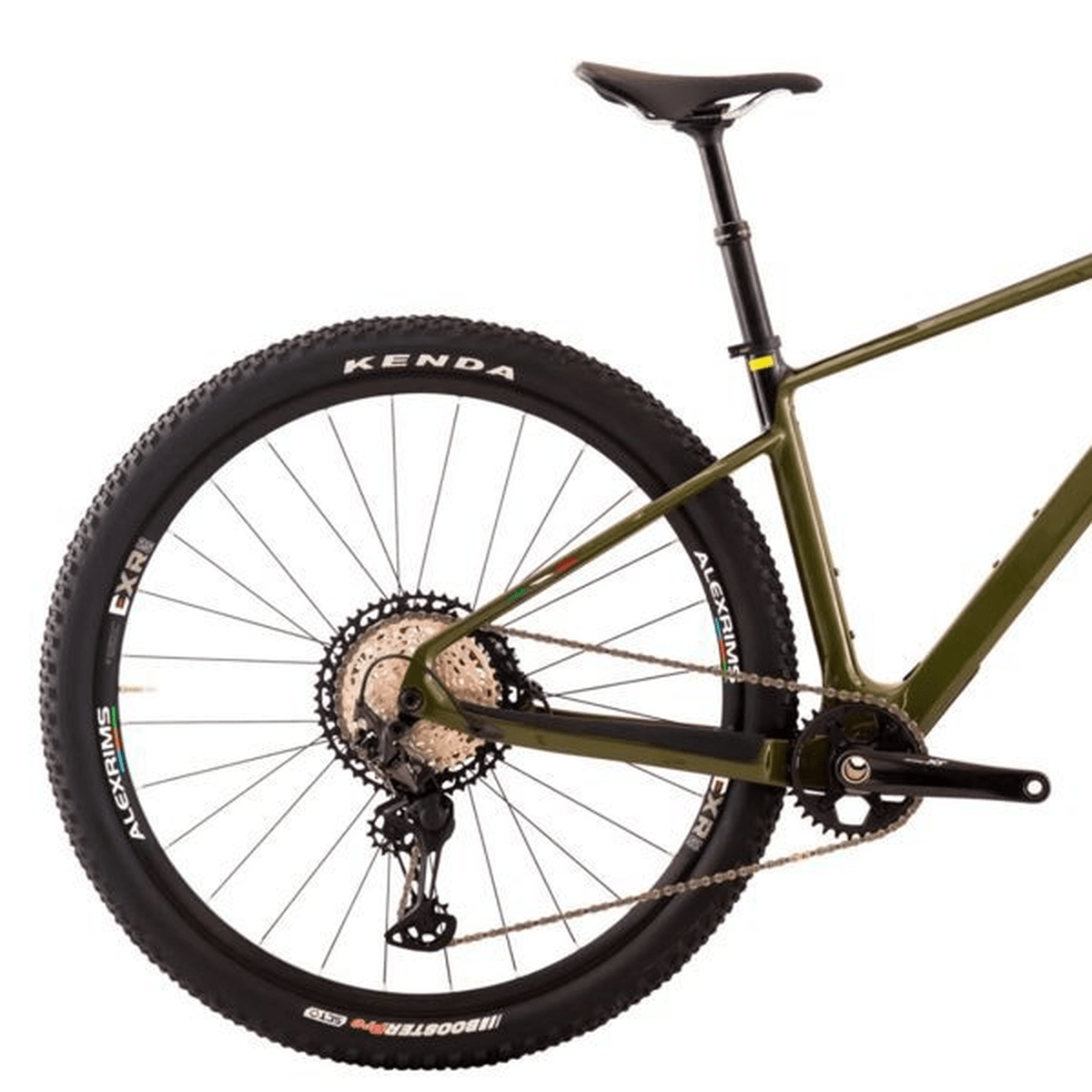 Cubos DT Swiss 350 com engates Ratchet 36 SL, aros Alexrims 25mm e pneus Kenda Booster Pro Tubeless Race;