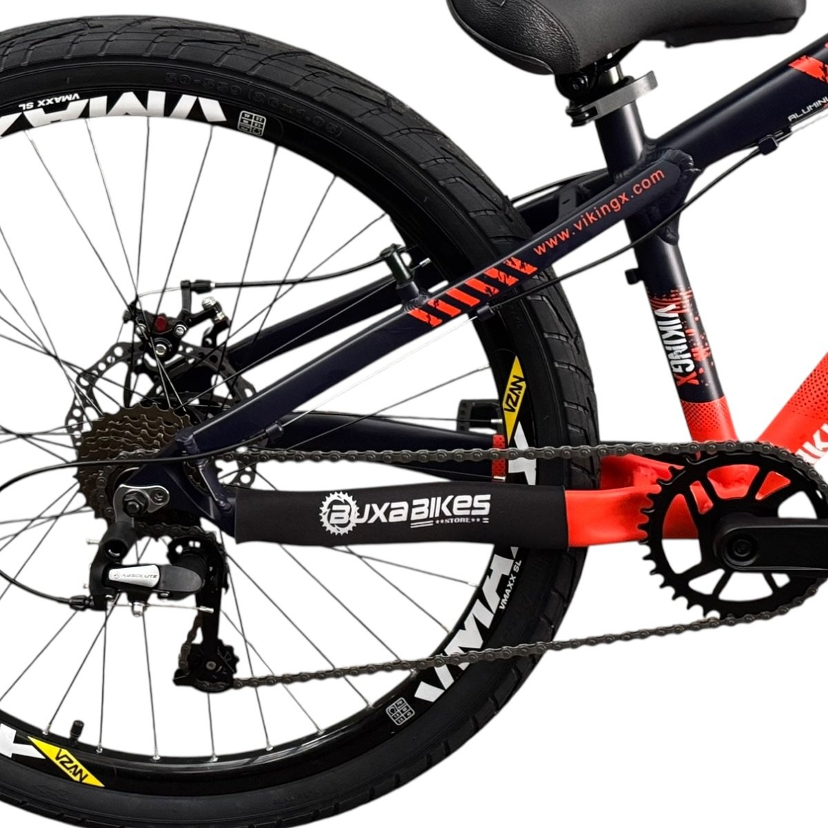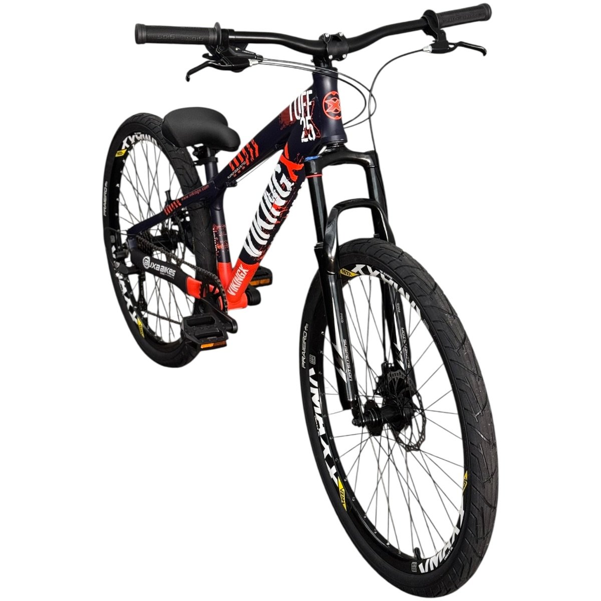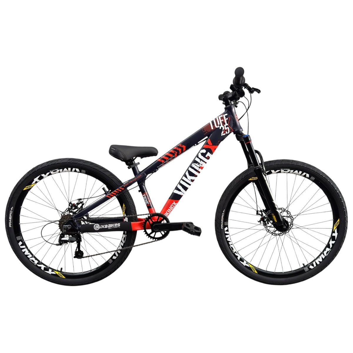 DESCRIÇÃO Os modelos da Vikingx são ideais para a prática de Freeride, uma modalidade derivada do estilo Mountain Bike, só que dentro da cidade, com obstáculos naturais ou criados especialmente para praticá-la. O Freeride é uma combinação do Downhill e do Dirtjumping (Street MTB, Urban Assault ou Urban Ride). Por isso, é conhecido também como Freeride Urbano. Para o esporte, é preciso utilizar uma bike específica, pois elas contam com características especiais. As Vikingx são ideais! Construídas em alumínio, com curta distância entre os eixos, permitem uma boa maneabilidade nos saltos e manobras. O quadro em alumínio, especialmente pensado para o Freeride, é projetado em geometria menor (rebaixado), justamente para facilitar as manobras. Além disso, a marca sempre se preocupou em apresentar peças reforçadas e robustas, oferecendo, ainda, suporte para freio a Disco ou V-brake. O visual agressivo complementa uma bike incrível e poderosa. ESPECIFICAÇÕES GARANTIA 3 meses Nas trilhas ou na cidade, vá de bike!! BUXA BIKES STORE
