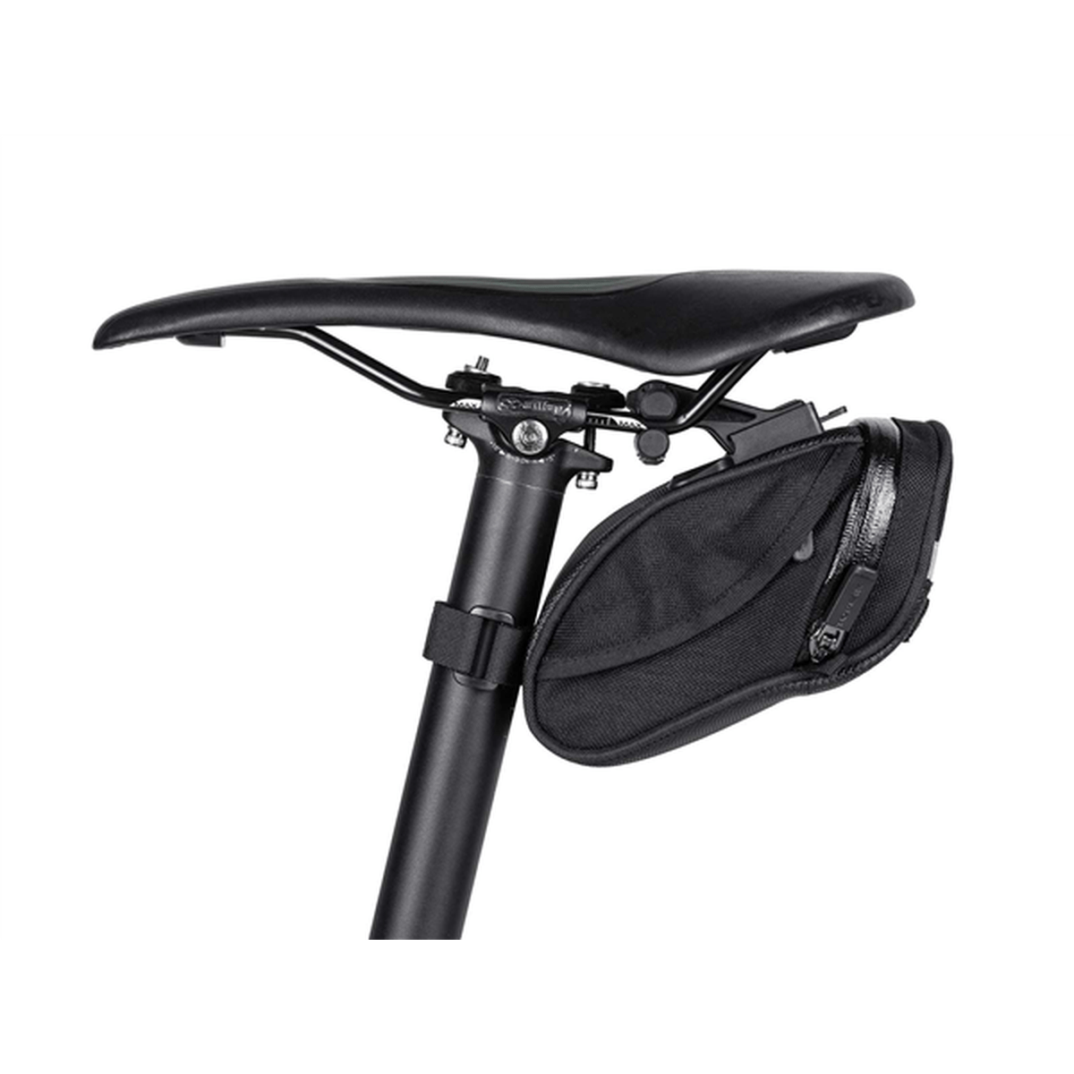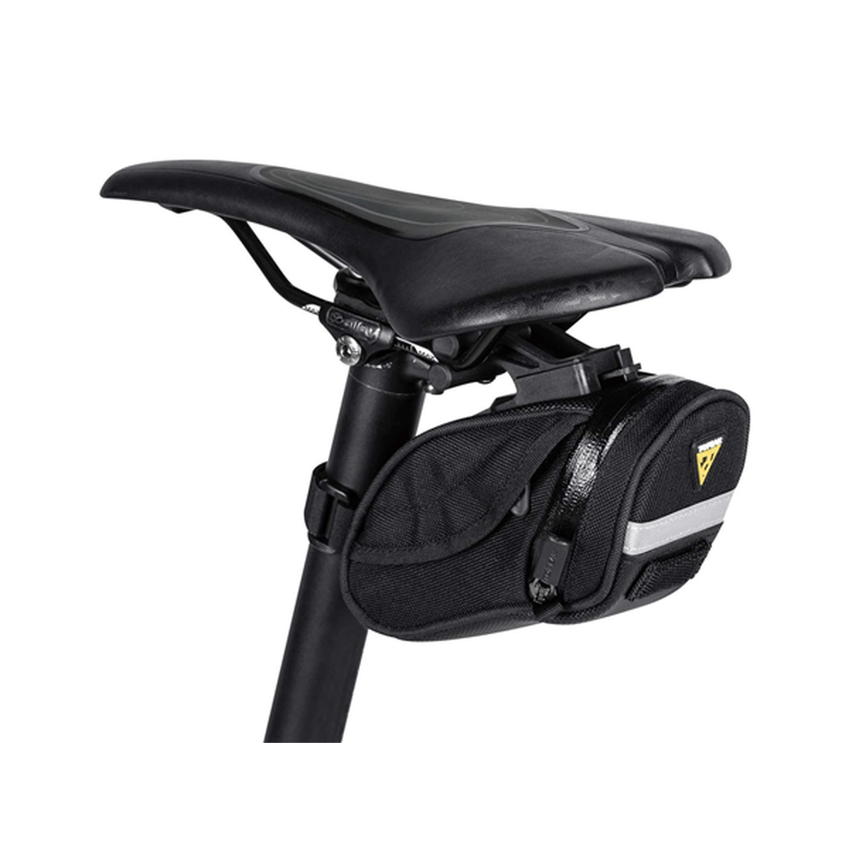A Aero Wedge Pack conta ainda com um sistema Quick Click permitindo que a bolsa seja fixada no selim através de um parafuso tornando-a bem fixa a bicicleta. Possui capacidade de 0.66L, fita refletiva 3M para maior visualização, fita para fixação de lanterna e proteção do ciclista e pode ser fixada em canotes de medidas 27.2 - 34.9mm.