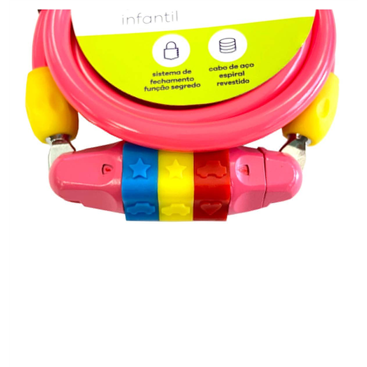 DESCRIÇÃO Cadeado divertido, as figuras ilustrativas tornam o ato de proteger a bicicleta uma brincadeira para as crianças. ESPECIFICAÇÕES Sistema de fechamento com função segredo em figuras ilustrativas. Cabo de aço espiral revestido Medidas: 120 cm x 8 mm Senha: 3 estrelas Cor: Rosa Peso: 216g GARANTIA 03 MESES Nas trilhas ou na cidade, vá de bike!! BUXA BIKES STORE